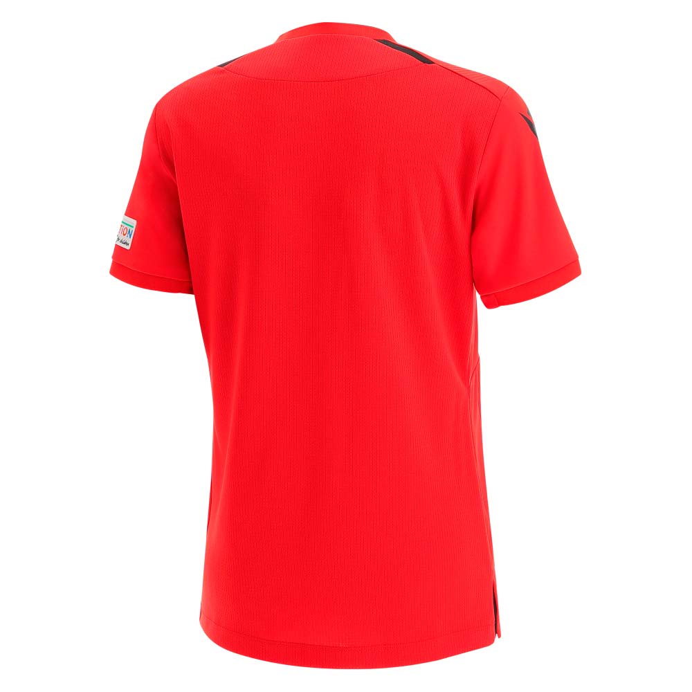 Het nieuwe scheidsrechtersshirt voor dames, geproduceerd door Macron voor UEFA, is uitgevoerd in het rood voor een opvallend ontwerp. Het shirt heeft een krijtstreep in reliëf en is verfraaid met 2 grote voorzakken met klittenbandsluiting en de tekst ‘Uefa Foundation’ op de linkerarm.